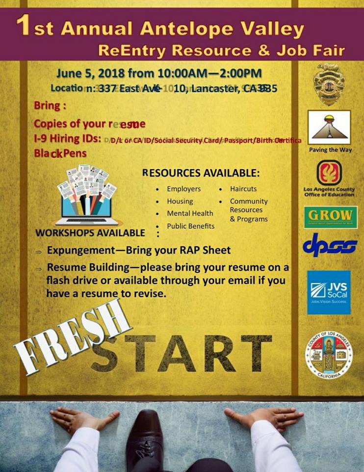 Hosted by Paving the Way Foundation,Inc. Tuesday, June 5 at 10 AM – 2 PM PDT 337 E. Ave K-10, Gr Building, Lancaster, CA There will be employers Expungement clinic and workshop Resume clinics Resources